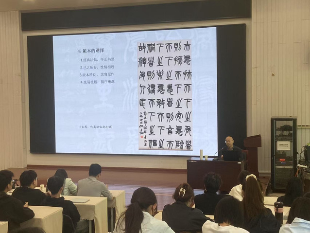仇高驰教授从执笔到笔法运用,从选帖到临创转换,从学习的阶段性到学习的规律性等全方位阐述了书法学习的方法和规律,他结合经典作品与自身创作心得,为师生带来了一场干货满满的艺术盛宴。