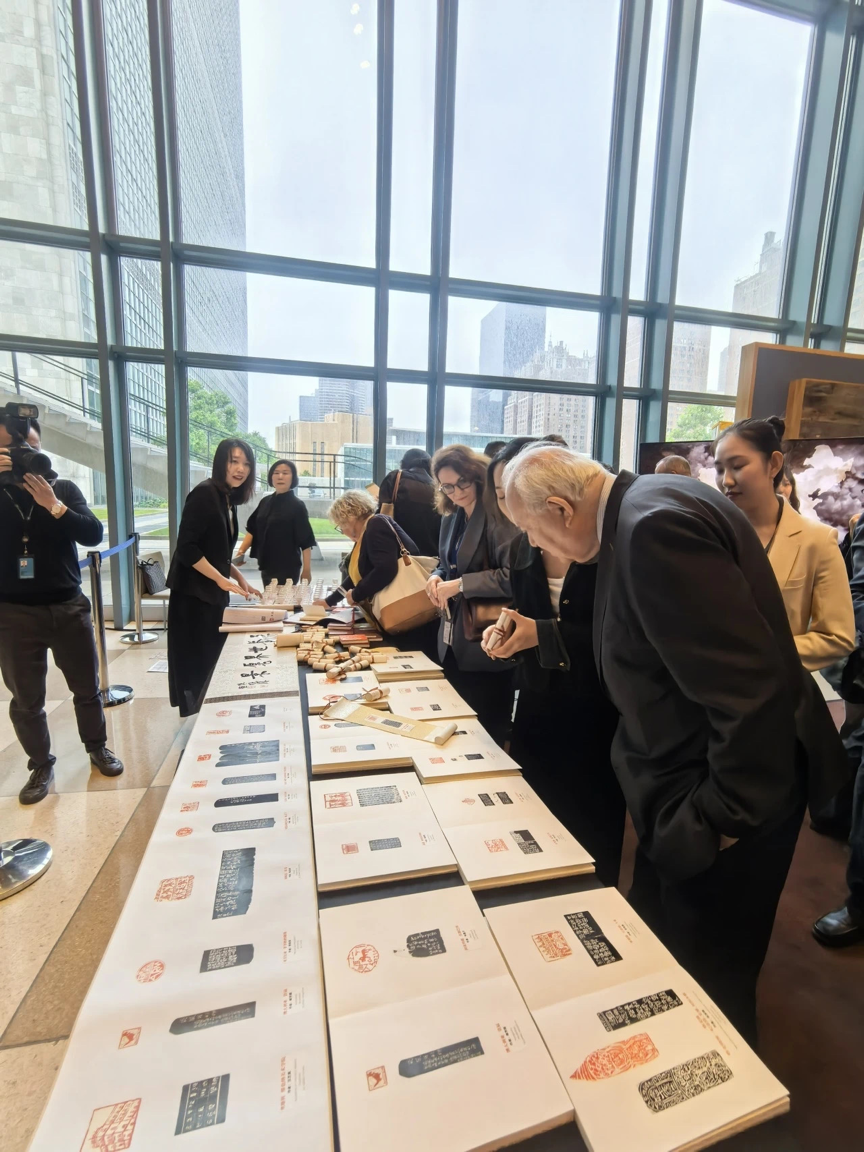 美国东部时间6月9日,值“文明对话国际日”庆祝之际,由浙江省人民政府新闻办公室、西泠印社策划的“文明互鉴·世界愿景”图形印展在美国纽约联合国总部大楼展出,中国常驻联合国代表傅聪大使,联合国副秘书长、文明联盟高级代表莫拉蒂诺斯以及部分国家常驻联合国代表或代办等中外嘉宾观展。