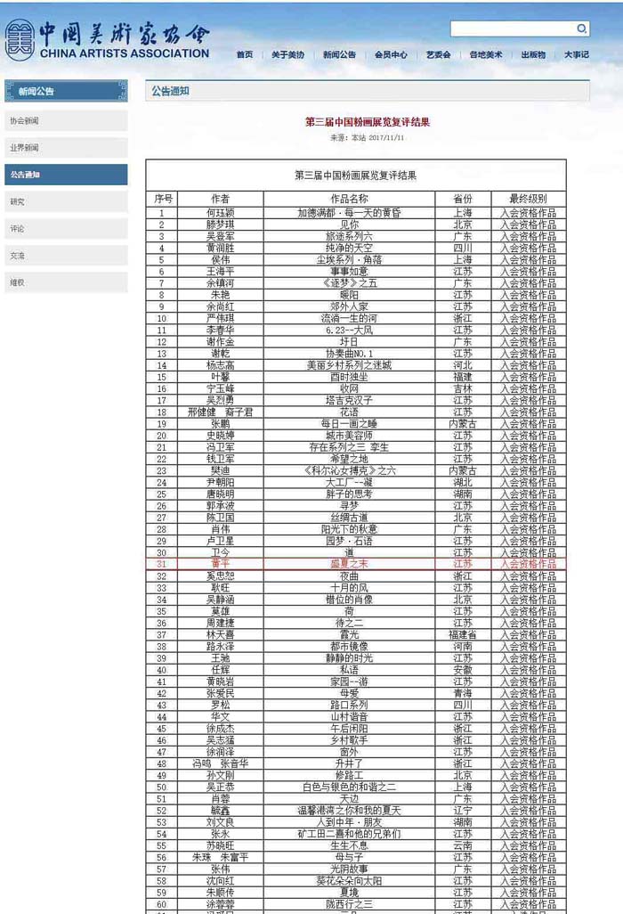 “第三届中国粉画展览”由中国美术家协会和江苏省文学艺术界联合会联合举办,中国文联美术艺术中心、中国美术家协会水彩画艺委会、江苏省美术家协会、江苏省现代美术馆、江苏省书画院承办,共入选169幅作品,该展评选出的入选作品前60件作品的作者具备申请加入中国美协会员的一次条件。