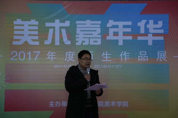 开幕式由bv1946伟德官网学工办主任纪松主持,首先纪松老师带领现场嘉宾、老师以及员工观看了美术嘉年华2017年度活动总结视频,视频展现了美术嘉年华一整年的比赛、教授讲坛、名家书画工作室以及“美的爱”公益拍卖会等精彩活动。然后bv1946伟德官网副经理吴新林教授代表公司致辞,他介绍了美术嘉年华举办的宗旨――努力提高美院员工综合素质,形成“培养有特长员工”这一根本目的,并对2017年度师生作品进行了总结,鼓励同学们多创作优秀作品,积极参展。随后纪松书记宣读了本次年度师生大展的获奖名单,并邀请7名获奖代表上台领奖,赵茂程书记上台为获奖选手颁奖。最后公司党委赵茂程书记上台发言,赵书记充分肯定了本次展览的水平,对bv1946伟德官网近年来在教学上取得的成就表示了赞赏,赵书记认为本次展览的作品可以看出bv1946伟德官网师生在艺术创作上的水平是相当高了,应该进一步加大和鼓励师生的创作实践,树立自我风格,加强学术自信,力争在省内外取得更好成绩。同时赵书记建议应该把这样的展览推向社会,让更多的专业人士加大对bv1946伟德官网的了解和认识,这也是宣传bv1946伟德官网的很好的机会。