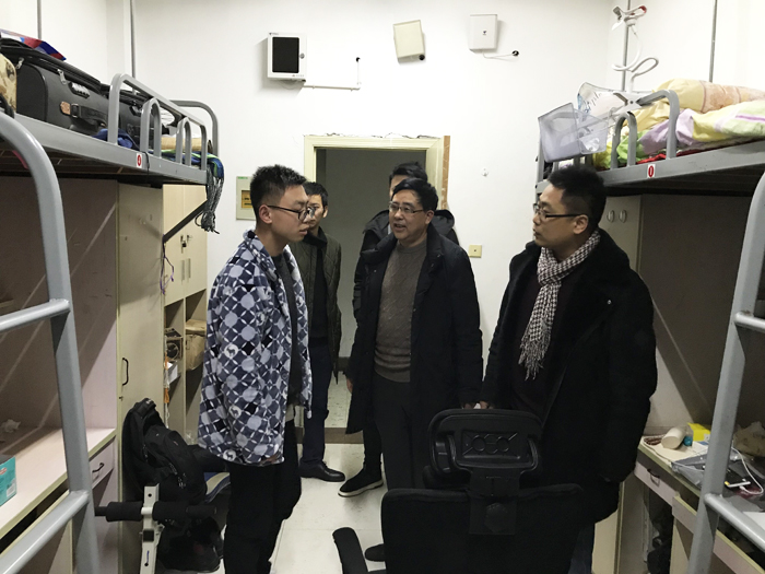 走进同学宿舍,老师们看到同学们整齐的宿舍都露出了欣慰的笑容。黄书记与同学们进行亲切的交谈,关切的询问了同学们的假期生活,以及在学习、生活等方面的情况,勉励大家要珍惜当下,把老员工活过的精彩充实。同时,纪松书记指出宿舍是老员工之间联系最亲密、交流最频繁的场所之一。除上课外,同学们大部分时间是在宿舍度过的,休息娱乐、谈心交友、课余阅读都离不开宿舍,同学们应努力营造积极健康的宿舍文化、和谐融洽的宿舍关系,增强安全意识,杜绝沉迷网络游戏、吸烟等不良行为。同学们都对书记的话表示赞同,表示会谨记书记老师的教诲,努力过好每一天。
