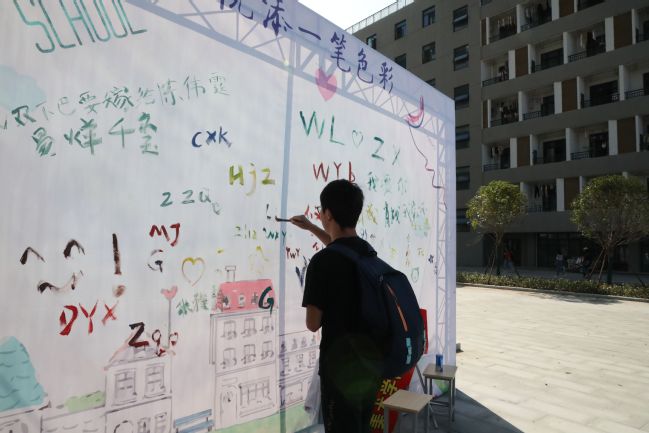 美院还特意为新生制作了一面绘画墙,让他们为美院增添一笔色彩,得到了新生们的喜爱,纷纷拿笔签名和画画,并争相在绘画墙前拍照留念。