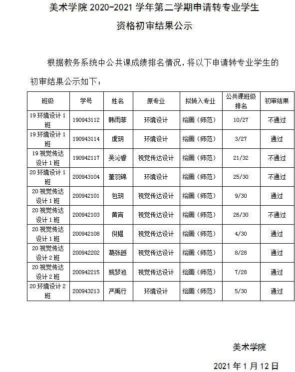 2020-2021学年第二学期申请转专业员工资格初审结果公示