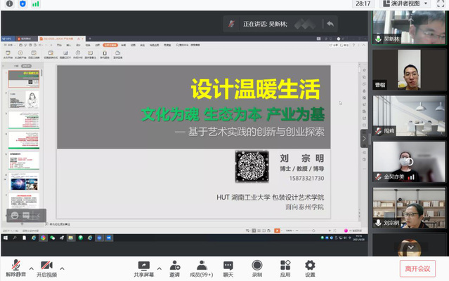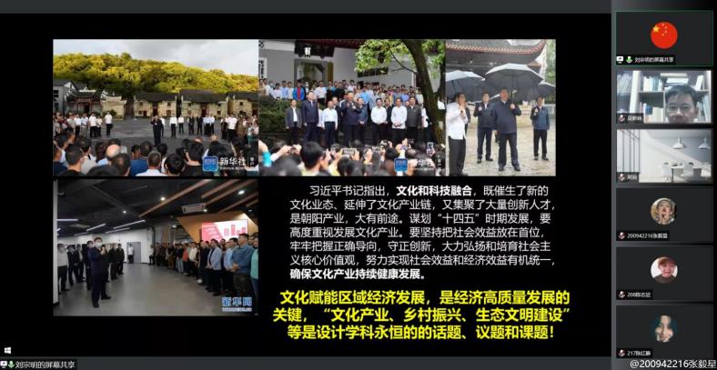 刘宗明教授以“设计温暖生活——基于个人艺术实践的创新与创业探索”为主题,结合时代发展特点和当下疫情背景下的国情,从“文化”、“生态”、“产业”三个方面展开叙述,介绍了当今社会对设计类人才的需求以及同学们将来的努力方向。讲座把握人民对文化的“自觉”、“自信”和“自强”,强调艺术工作者应当以提升人民精神层次为使命。最后,刘教授强调,当今世界正经历百年未有之大变局,艺术工作者要了解各个学科领域之间的关联性,积极和国际社会沟通。讲座结束后,师生代表与刘教授进行了深入的互动交流。