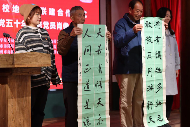 公司党委副书记邓友祥与海陵区委常委、组织部部长周银松现场为泰州公司党性教育基地揭牌;公司党委常委、组织部部长吉泰根与海陵区委组织部副部长、区委党建办副主任陆荣签署校地党团联建合作协议;书法专业员工党员为老党员赠送书法作品。