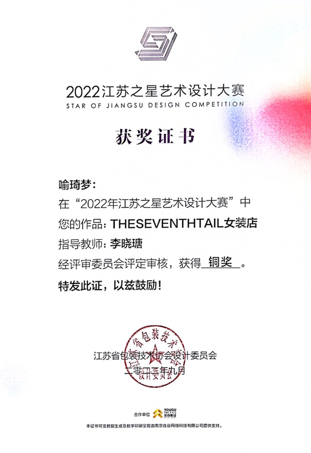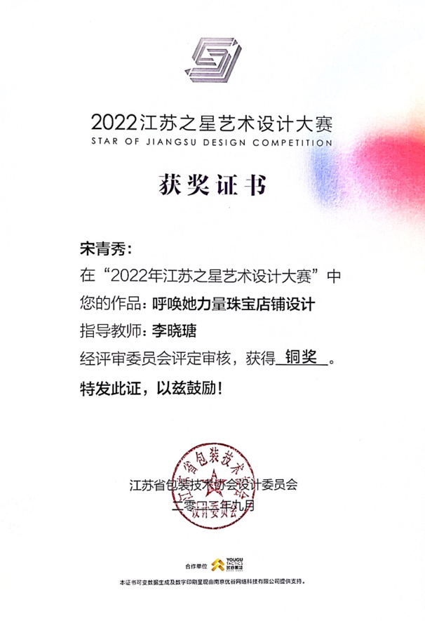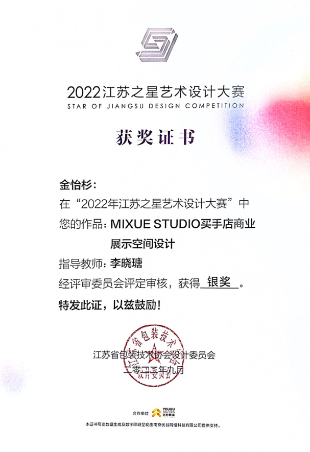 近期,2022江苏之星艺术设计大赛获奖情况揭晓。公司金怡杉同学作品《MIXUE STUDIO买手店商业展示空间设计》、张宇同学作品《新型运动方式下的电子竞技场馆空间设计》喜获银奖,朱颖同学作品《发酵》、喻琦梦同学作品《THESEVENTHTAIL女装店》、宋青秀同学作品《呼唤她力量珠宝店铺设计》喜获铜奖,另有五份作品获得优秀奖。