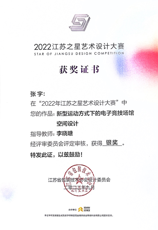 “江苏之星艺术设计大赛”是江苏地区最高级别的综合性艺术设计大赛之一。该赛事是由我国改革开放后,国家批准成立的第一个专业协会——包装技术协会所创办,四十多年来评选出众多优秀作品,培养出大量的高水平设计人才,在省内外设计界影响很大。大赛涵盖了包括新媒体设计在内的所有现代艺术设计专业。