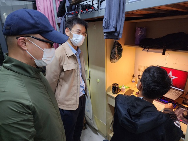 吴新林走进员工宿舍,与员工亲切交谈,仔细询问大家学习生活情况,提醒大家注意身体,加强户外锻炼。老师和同学们心连心,始终陪伴在大家身边。他要求公司针对员工提出的合理要求,在满足疫情防控的要求下尽快研究落实。