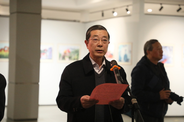 泰州市政协原副主席、泰州市老年书画协会名誉会长马云宣布展览开幕。(吴新林)