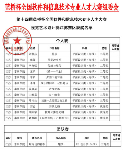 2023年6月1日,工业和信息化部人才交流中心主办的第十四届蓝桥杯全国软件和信息技术专业人才大赛--视觉艺术设计赛江苏赛区比赛结果公布。公司学子取得二等奖6项、三等奖4项、优秀奖3项的好成绩。