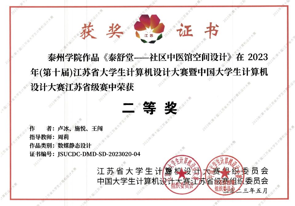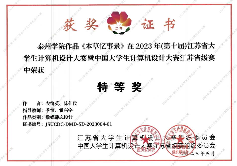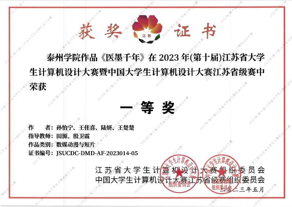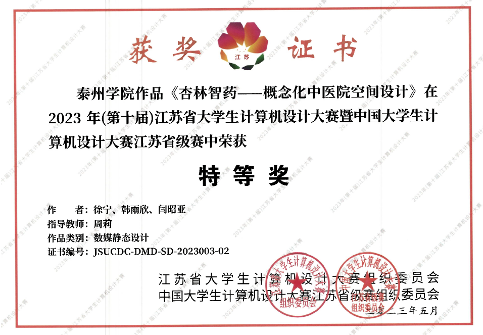 徐宁、韩雨欣、闫昭亚同学合作的数媒静态设计作品《杏林智药——概念化中医院空间设计》(周莉老师指导)和农笛英、陈佳仪同学合作的数媒静态设计作品《本草忆事录》(季恒、霍兴宇老师指导)获大赛特等奖;孙怡宁、王佳喜、陆妍、王楚楚同学合作的数媒动漫与短片作品《医墨千年》(田源、殷卫霞老师指导)获大赛一等奖;卢冰、施悦、王闯合作的数媒静态设计作品《泰舒堂——社区中医馆空间设计》(周莉老师指导)获大赛二等奖。以上获奖作品均成功晋级国赛入围名单。