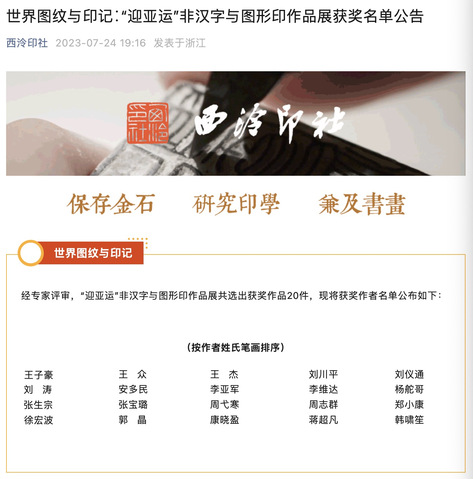 7月24日,由西泠印社主办的世界图纹与印记:“迎亚运”非汉字与图形印作品展获奖名单公布,经专家评审本次展览共选出获奖作品20件,公司青年教师刘仪通以作品《马尔代夫》获奖。