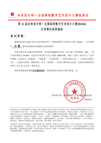 8月15日,由工信部人才交流中心主办,教育部中国高等教育学会认定的2023第11届未来设计师·全国高校数字艺术设计大赛(NCDA)江苏省赛区获奖名单公布,该赛事已连续四年入选《全国普通高校学科竞赛排行榜》。在本次竞赛中,公司师生共斩获14项奖项,其中一等奖1项,二等奖3项,三等奖10项;同时李晓瑭老师获得省优秀指导老师。本届省赛,公司首次摘得一等奖,实现了历史性突破。省赛一、二等奖作品将直接入围全国总决赛,期待公司在全国赛中取得更多突破。