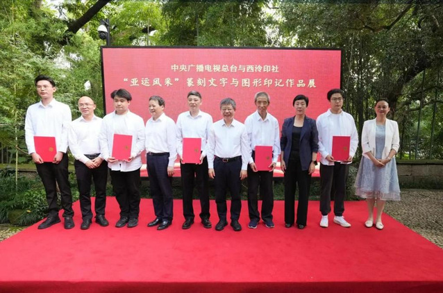 9月25日,中央广播电视总台与西泠印社共同举办的“亚运风采”篆刻文字与图形印记作品展开幕仪式在浙江杭州西泠印社举行。中央广播电视总台编务会议成员姜文波,浙江省委宣传部副部长范庆瑜,杭州市委常委、宣传部部长黄海峰,中国文联副主席、西泠印社副社长兼秘书长陈振濂,中央广播电视总台浙江总站党委书记胡作华共同为展览启幕。