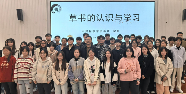 在讲座过程中,纪松还结合自己多年的创作经验,分享了学习草书的方法和心得。他强调,草书不仅是一种文字书写形式,更是一种艺术表达手段,需要学习者具备扎实的书法基础、敏锐的艺术感悟力和丰富的情感体验。同时,他也鼓励在场的同学们要勇于尝试、不断创新,努力在草书艺术的道路上走得更远。讲座结束后,纪松还与现场同学进行了互动交流,耐心解答了大家提出的问题。