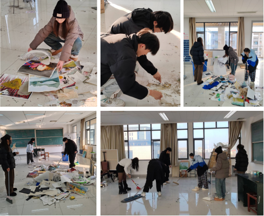 画室在经年累月的使用过程中,逐渐被灰尘笼罩,废弃绘画工具四处散落,脏乱的环境不仅影响了教室的美观,也在一定程度上干扰了师生们的教学与学习热情。为改变这一现状,环境设计专业23级的同学们积极响应,精心策划并组织了此次主题活动,旨在号召全体同学共同行动起来,美化课堂,打造一个干净、舒适、充满艺术氛围的学习空间。
