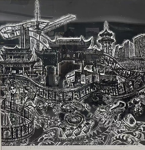 姚梦池,《泰州·您早》,版画,92x92cm