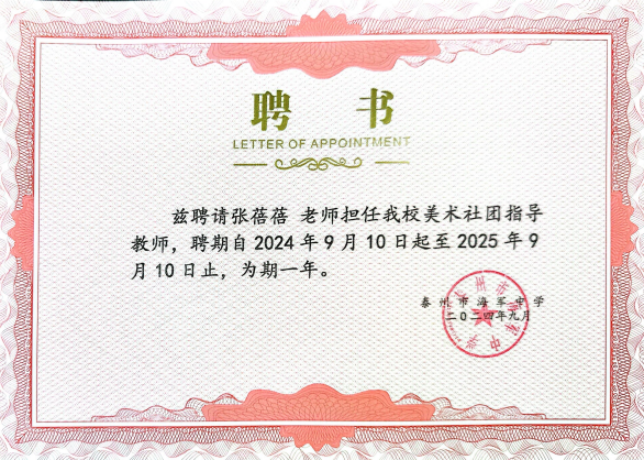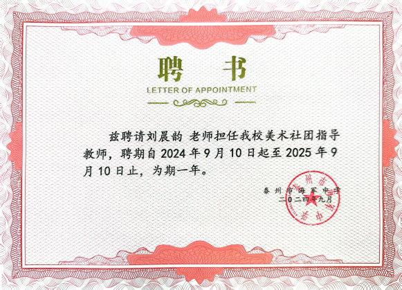 9月10日,公司美术教育系张蓓蓓、刘晨韵、树德力、夏伊乔四位老师受聘成为中学美术社团指导老师。