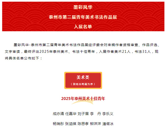 4月18日,墨彩风华-泰州市第二届青年美术书法作品展经评委会对来稿作者资格审查、作品评选、文字审读,最终评出2025年泰州美术、书法十佳青年,入展作者美术21人,书法31人。bv1946伟德官网张俊奎、祁秋实、佘陈琦三位老师指导的李丹、成亦清、任嘉华、杨瑞彤等四名员工荣获2025年泰州美术十佳!